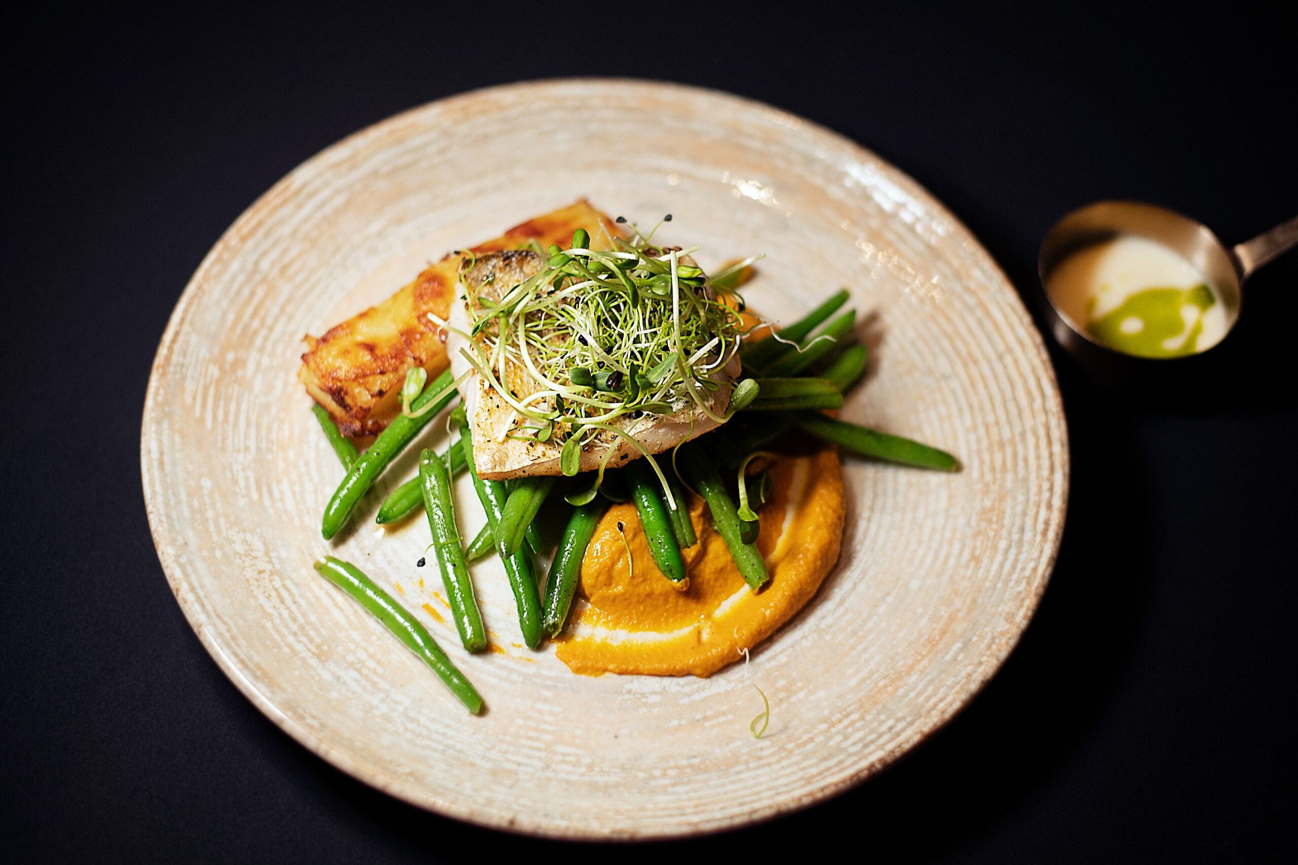 Vakarienė vyksta jaukioje ir elegantiškoje aplinkoje, kuri sukuria ypatingą atmosferą. Subtilus apšvietimas ir garsas papildo skonių kelionę, kur kiekvienas kąsnis tampa įsimintinos patirties dalimi.